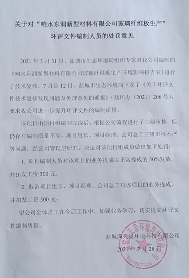 关于对"响水东润新型材料有限公司玻璃纤维生产”环评文件编制人员的处罚意见